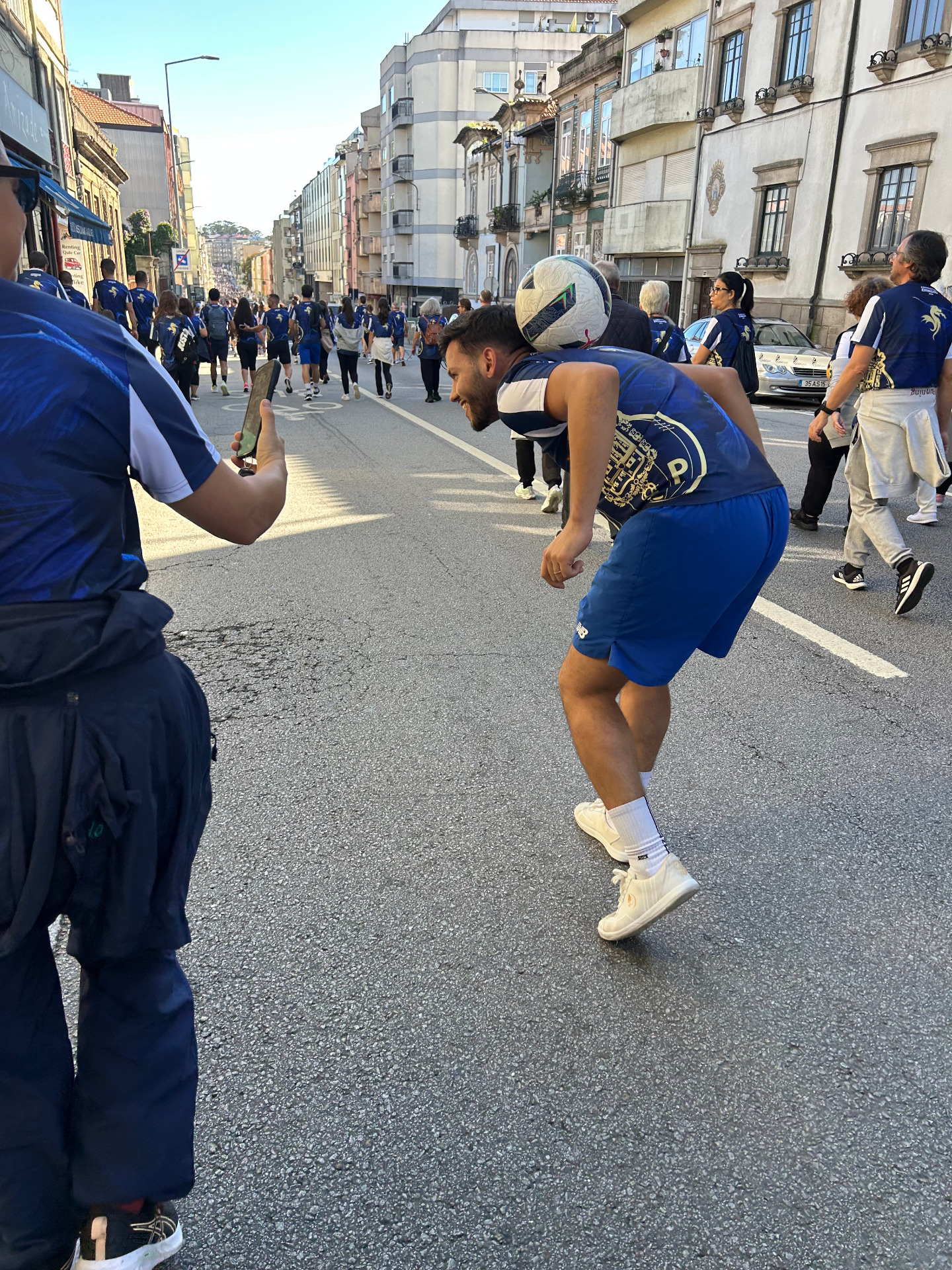 Antes do arranque da caminhada, Rui juntou-se ao aquecimento geral e rapidamente atraiu atenções com a bola. Durante todo o trajeto, manteve a interação com o público, realizando manobras técnicas e incentivando quem seguia ao seu lado.